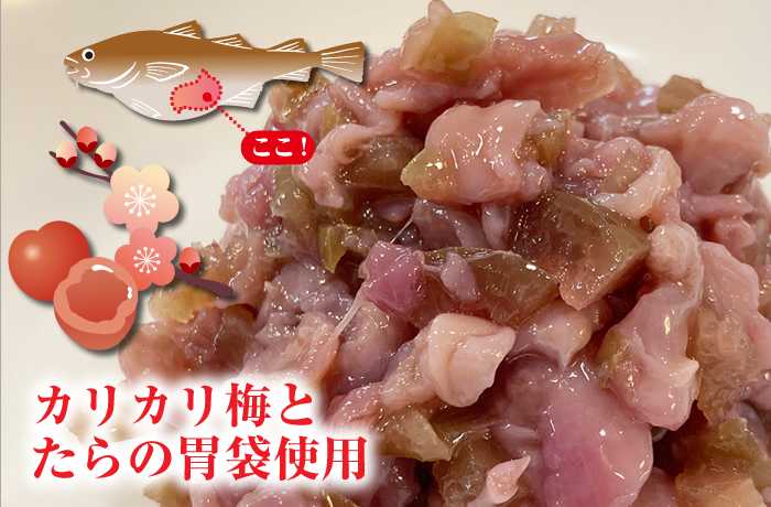 カリカリ梅の食感と1匹に1個しかない稀少なたらの胃袋のコリコリ・プリプリとした食感が楽しめます。